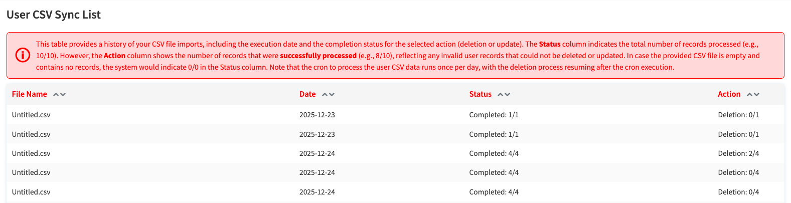 By clicking on the File Name of a particular CSV file, you will be redirected to the User CSV: Added/Updated/Deleted Records List, listing the exact user records affected in detail. The logs table further lists the file name, date of upload, its current status (completed or in progress), and the number of actions (of an action type) successfully completed. If all records were completed, the Status column will indicate n/n records as done; if a record was invalid and skipped, this is indicated as, e.g. 10/13. The same applies to the Action column.