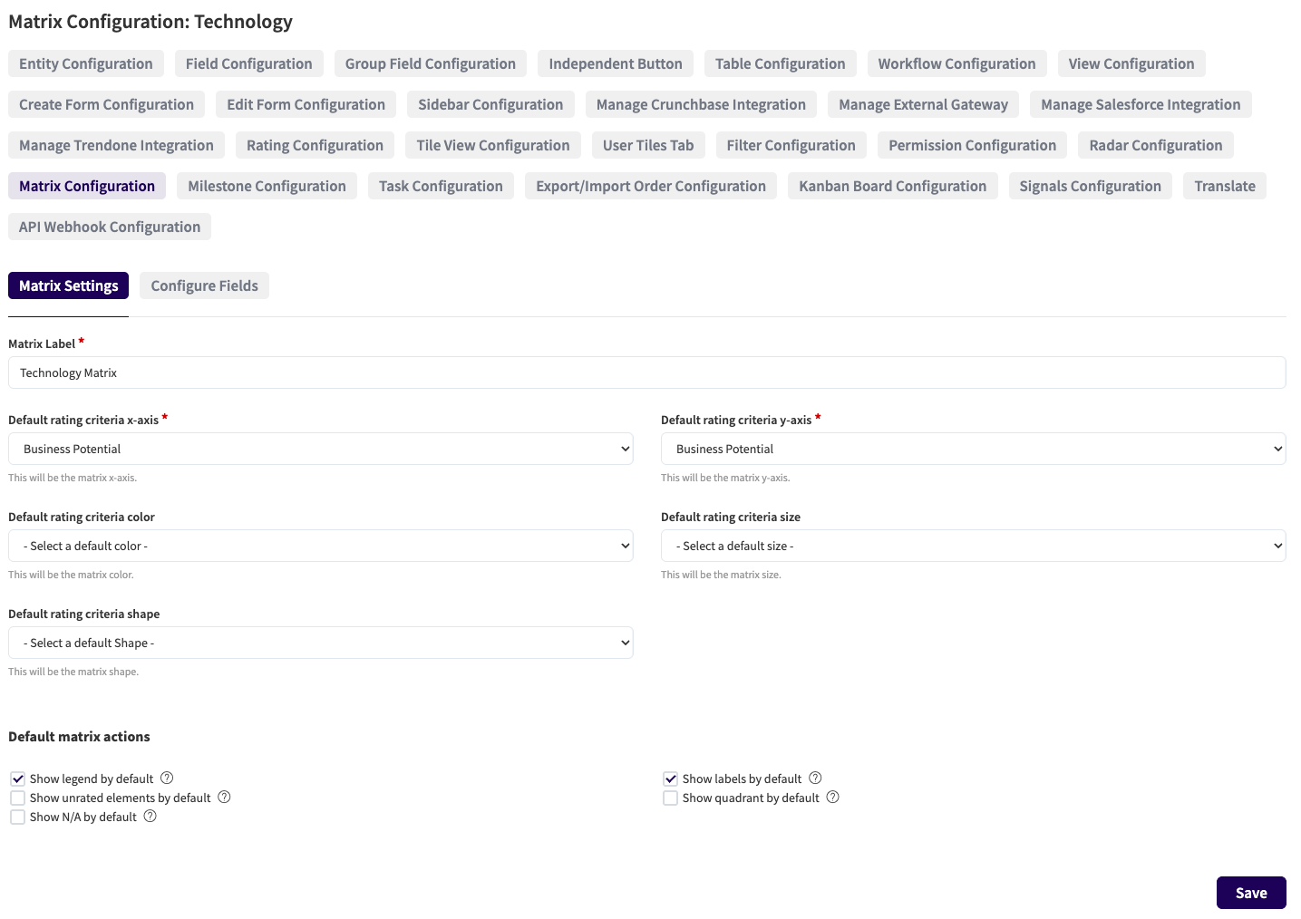 Next, go to the Matrix Configuration tab and start configuring the basic view under the Matrix Settings sub-tab:
