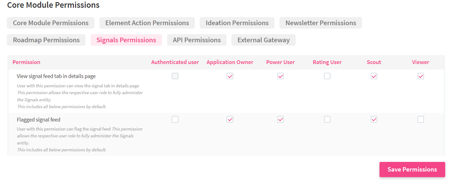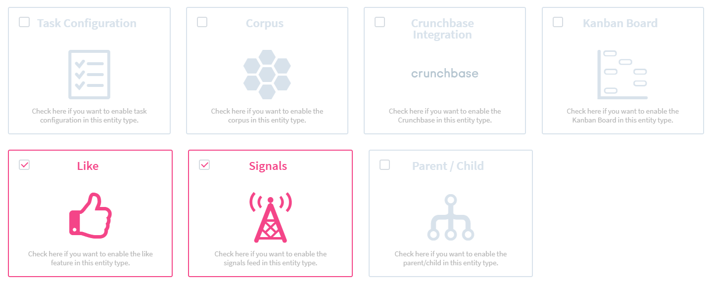 On the edit page of an entity, scroll down to the Enabled Modules/Features for this Entity section. Enable the signals feed for this entity type by selecting the checkbox. When ready, scroll down and click the Save button.
